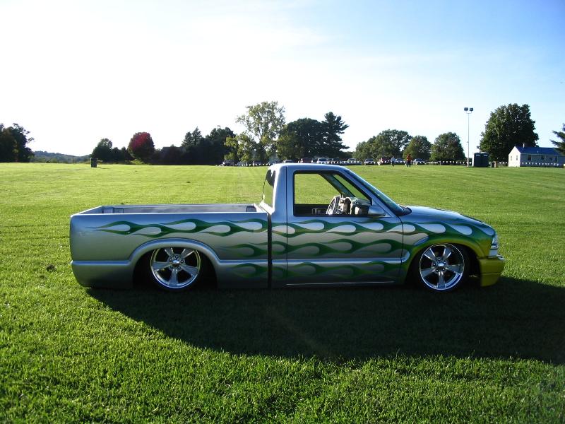 PPG Sparkle Aluminum with a Prizmatic Flake, Flamboyance Yellow and Radiance Green flames, Outlined in a Bright and Blod Blue, and Old Skool Pin Striping. Shaved Door Handles, Tail Gate Handle, Cab Seams, Bed Seams, Gas Door, Antenna, Hood Squirters, 3rd Break Light, 96 Cadillac DeVille Tail Lights, Molded Sir Michaels Roll Pan, Custom Wheel Tubs, and Rhino Lining Spray on Bed Liner.