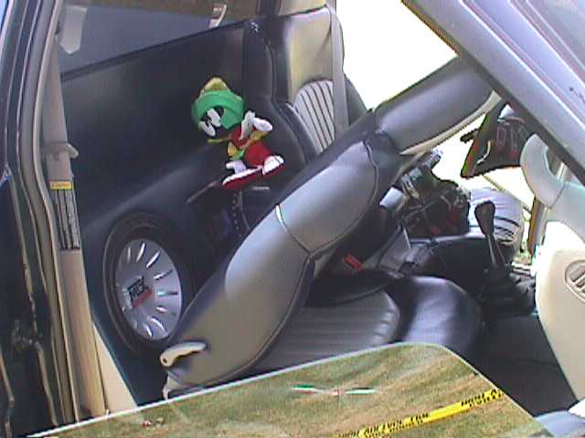 6.5" pyle tv, VCR, Playstation 2, seats and door panels wrapped in blue and grey leather indiglow guages carbon fiber shift knob