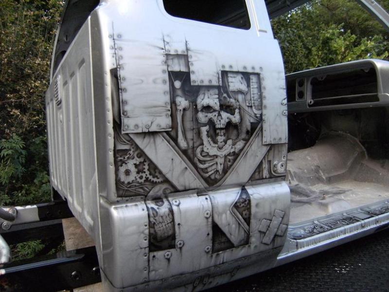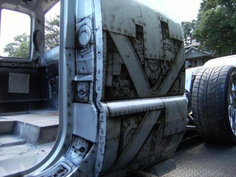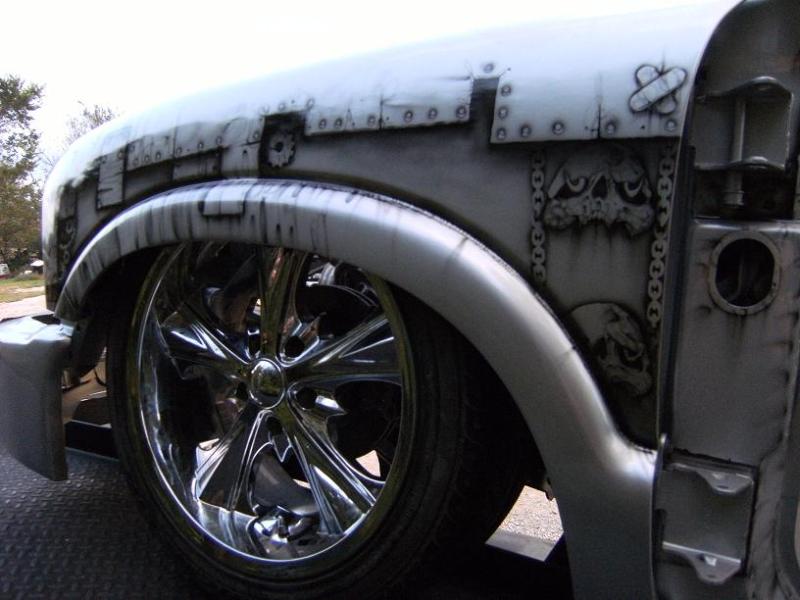 Sheetmetal bumper, s10/noma grille, tilt hood, stretched hood and fenders to windshield, grand prix doorhandles, tilt bed, sheetmetal bedfloor, Grant Kustoms skin, flushmount LEDs, shaved hood squirters, firewall,mirrors, 3rd brakelight, gas door, tailights, cab seams. Andromina silver with airbrush graphics by Jesse Marrow.