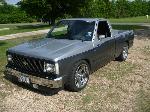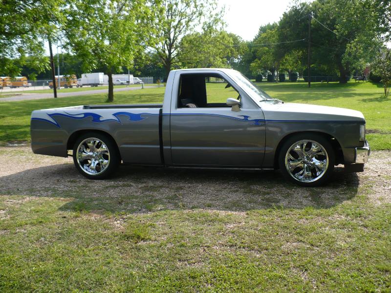 1992 Chevy s-10 pickup with a 1988 s-10 pickup front clip, after market chrome bumper, clear parking and marker lights (L.E.D), billet grill with billet s-10 emblem, lower valance after market fog lamps modified. Finders body line shaved/molded, windshield cowl and window squirts shaved/molded. After market modified shaved/molded mirrors replaced with 1968 Camaro mirrors, shaved/molded doors body line shaved/molded. Body lines shaved/molded, After market filler plates (replacing the factory tail lights), tail gate skin, roll pan, all shaved/molded into truck bed structure. License plate box shaved/molded into tailgate skin. In roll pan Cadillac tail light buckets and lights shaved/molded into truck bed structure. Lebraa vinyl bed cover Over all modified drop suspension springs and block-leaf spring with after market air shocks. 18 inch wheels chrome Panthers. Custom paint three tone light silver, dark gray, blue tribal flame.