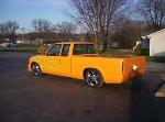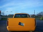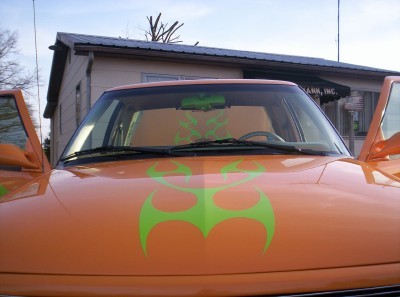 custom orange/with lime green ghost tribal flames, 18in rims, Cadillac Frenched tail lights, shaved door handles, shaved tailgate and rollpan, shaved gas door, billet grill, street scene front bumper, custom mirrors