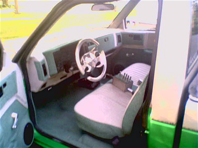 sold. Green & pewter tweed, door panels I made of fibre glass with speaker pods and tribal flames, tribal flames on dash, billet window cranks, billet steering wheel