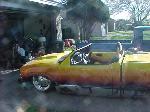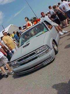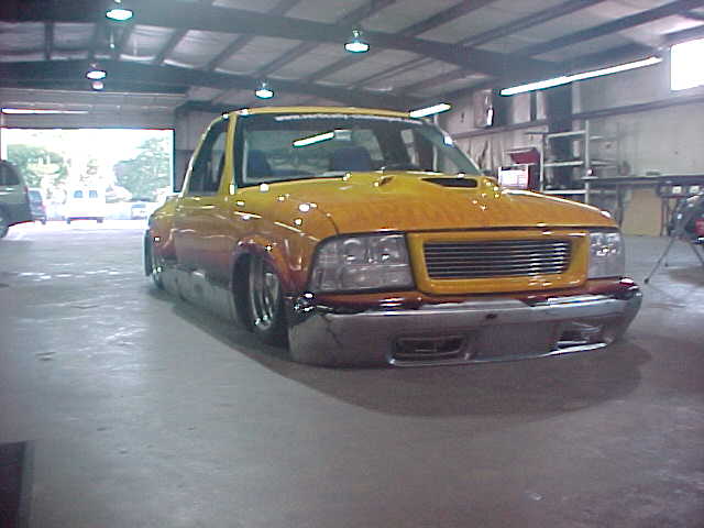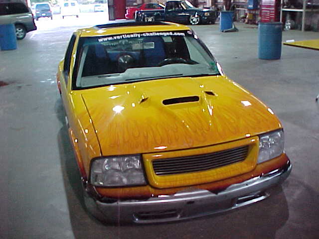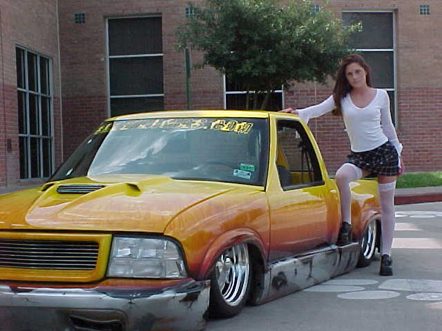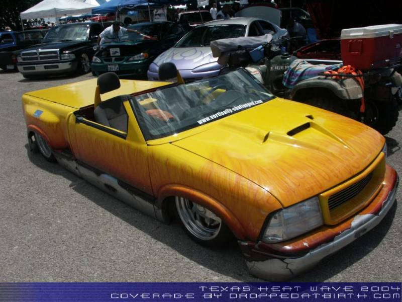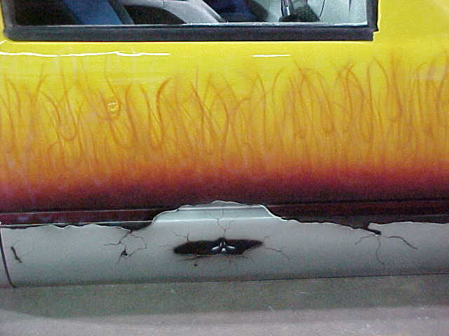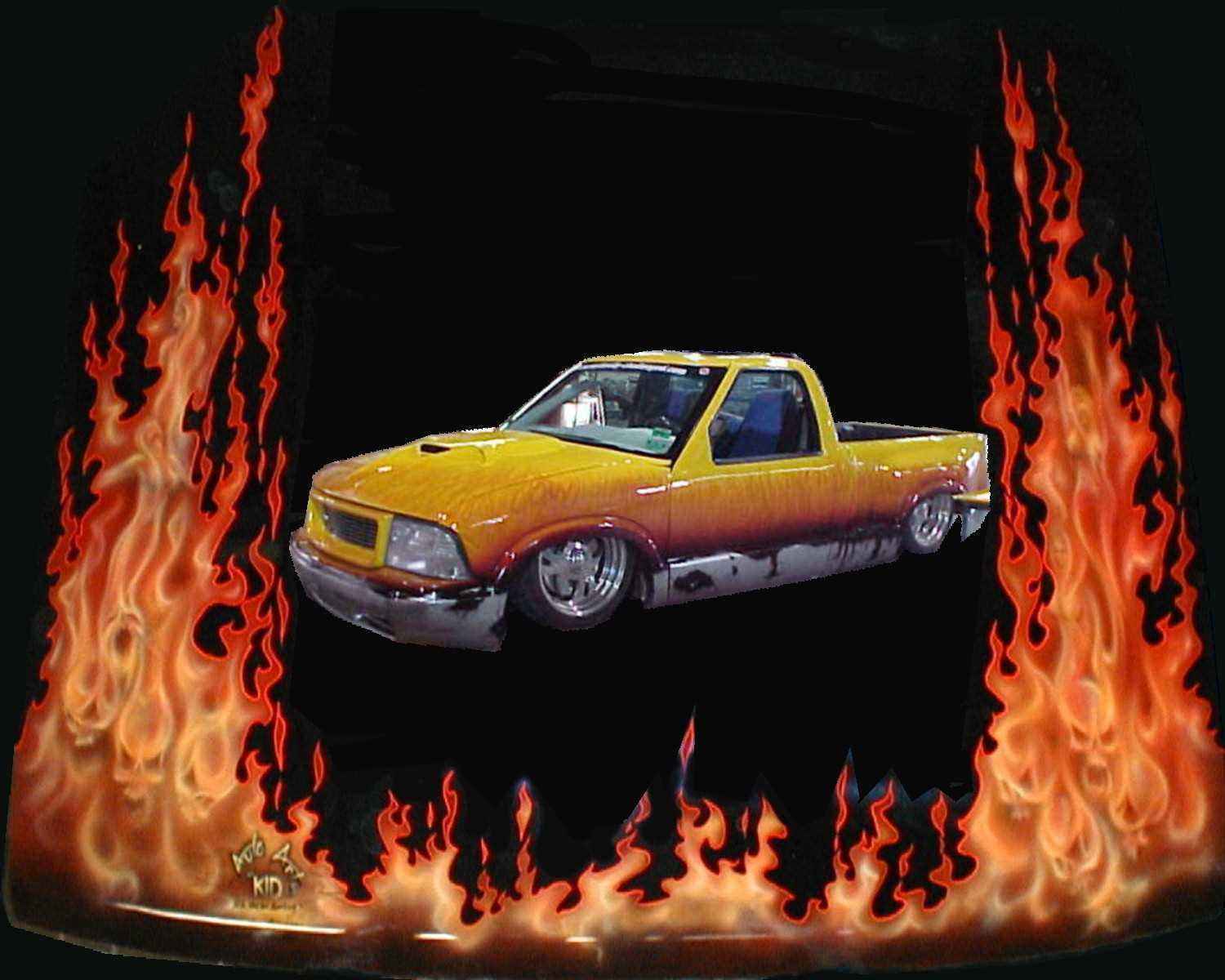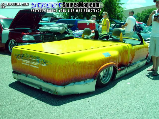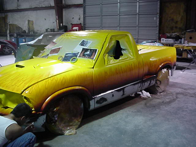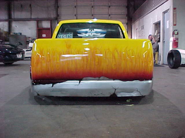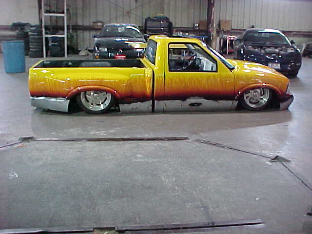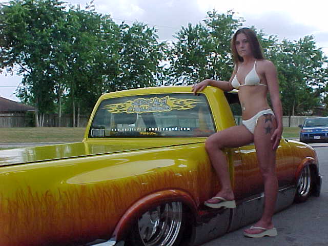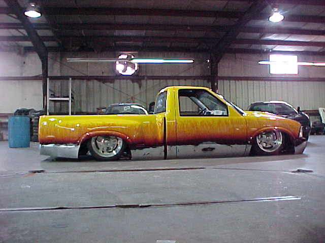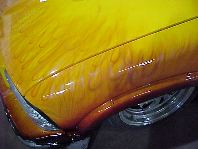 Shaved: door handles, tailgate, mirrors, squiters, gas door, wipers, antenna. 5 1/2 inch body drop to the doors , Yellow base , orange, red fire going up w/granite on bottum