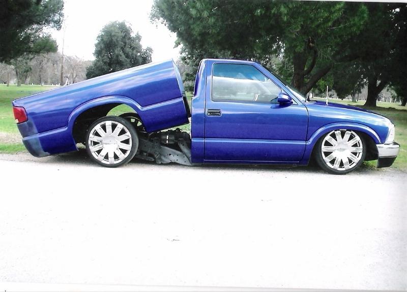 Shaved tailgate handle with relocator, third brake light, hood squirters, rollpan. 98 S10 front bumper, billet grill, clear corners & street scene side mirrors...SOLD
