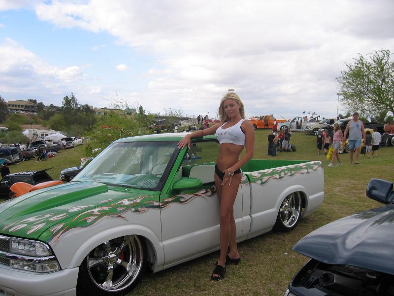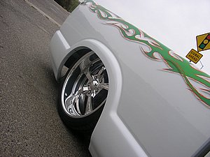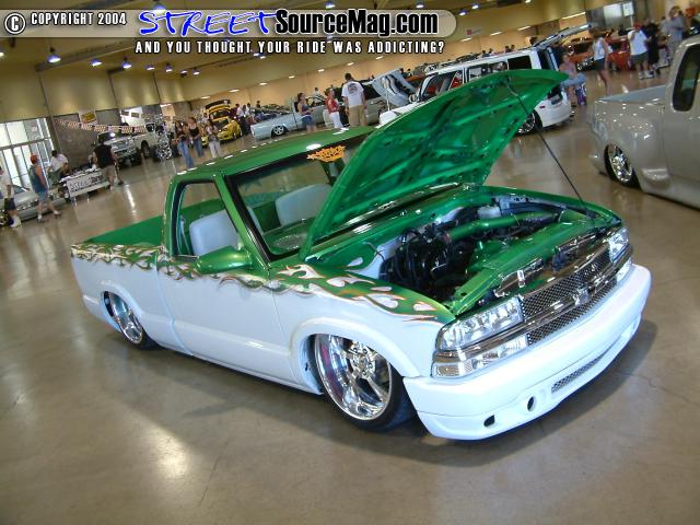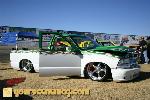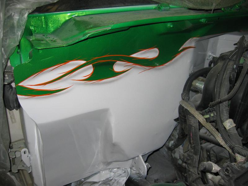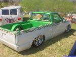 DUPONT HOT HUES PAINT (MIDORI SOUR GREEN OVER WHITE. WITH ORANGE PIN. FULLY SHAVED CAB. SHAVED ANTENNA SHAVED REAR END WITH KADEEZ. SHEET METAL BED WITH HOT HUES TINT IN THE LINE-X. FLUSH MOUNTED CHOPPER GAS CAP IN BED. CLEAR HEADLAMPS WITH CLEAR CORNERS. SS SPEED GRILL, SS MIRRORS, SS VALANCE. GOODMARK STEEL COWL HOOD.