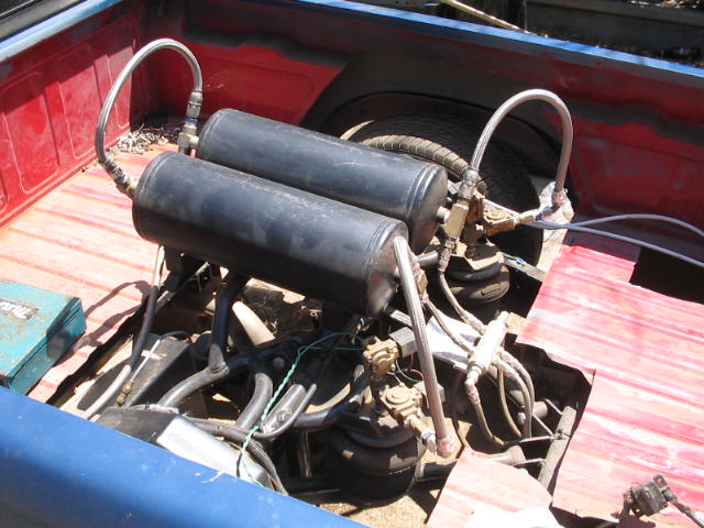custom 4 link done by myself, custom plumbing block for the tanks, stainless steel aircraft line through the whole truck, 8 valves, 2 3 gallon tanks, 4 little compressors, bottle