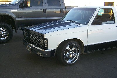white with black rocker panels, roll pan, shaved wiper cowl, shaved door handles, shaved antenna hole, phantom grill, chrome smoothie front bumper, euro bumper and corner marker lights, cowl hood, valance, chrome diamond mirrors, custom mirror filler panels made out of bug sheet metal, shaved molding, bed cut out for c notch, cab notched for driveshaft clearance, custom flame graphics, diamond projector headlights, rear tubs, shaved squirters, shaved tailgate, shaved tail lights, 10" led strips frenched into the roll pan, tailgate handle flip kit, chrome mazda b2200 tailgate handle, billet rear license plate frame, personalize plates "I DRAG", 3" body drop, shaved firewall, suicide doors, sheet metal bed, shaved gas door, flush mount pop up gas cap