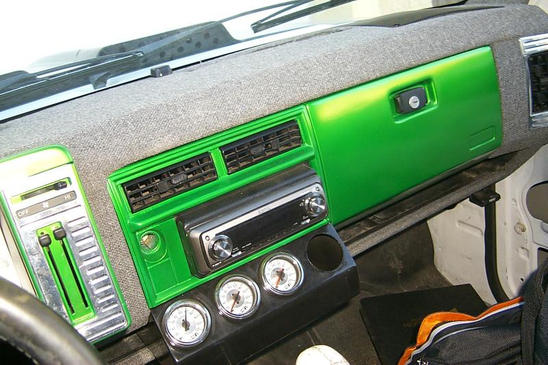 98 mustang bucket seats, billet spider web rear view mirror, polished shift column, custom skull shift knob, colorado customs spider web steering wheel, custom tweed flame headliner, chrome window cranks, 20% window tint, tweed a-pillars, tweed dash, billet flame skull pedals, custom gauge mount, green 10 toggle switch box, 1 single needle air guage and 2 duals, alarm, billet dash accents, chrome fire extinguisher, painted glove box door, painted gauge surround, tweeded and smoothed/flamed door panels, billet lokar oval door handles, tweed shift boot