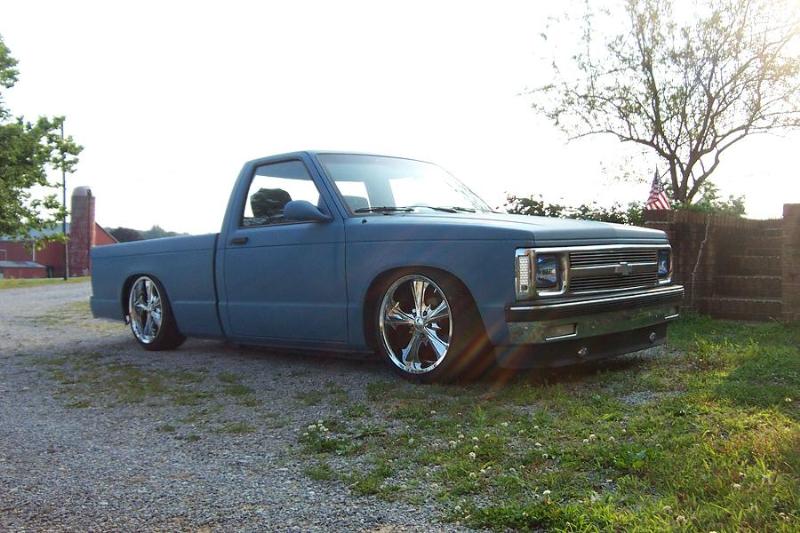 bright blue paintjob i jus got done doin shaved tailgate wit recessed license plate, shaved antenna. rollpan, mirrors, billet grille, headlights