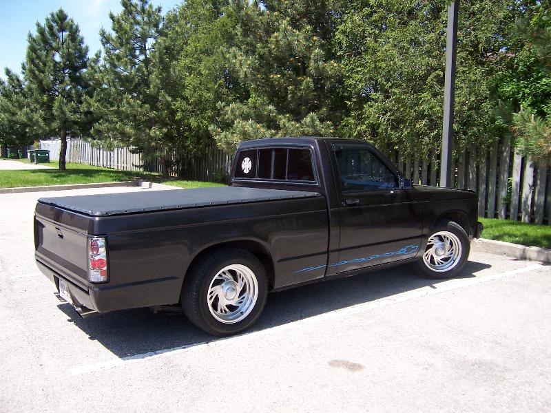 gun metal gray paint, blue flamed decals, euros all the way around, hidden hitch, rollpan...... true dual hooker exhaust