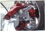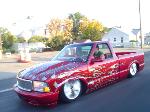 Shaved everything, Suicide doors, sheet metal bed, caddy tails, hand fabricated 2" cowl hood, 98 Sonoma front end swap R-M Carrizma Candy Apple Red paint with lots of flames.
