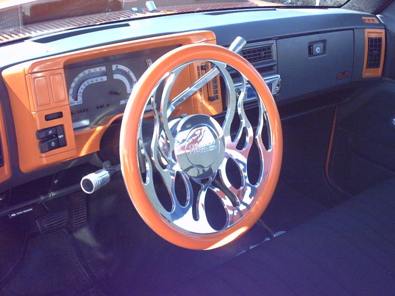 Black tweed, white face gauges, billet steering wheel with painted half wrap, billet shifter, billet rear-view mirrior