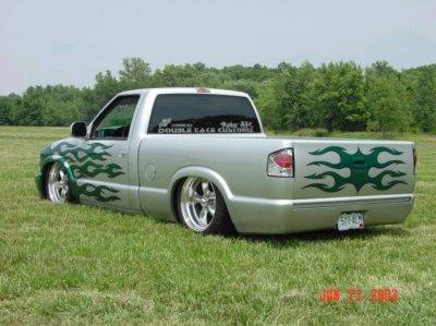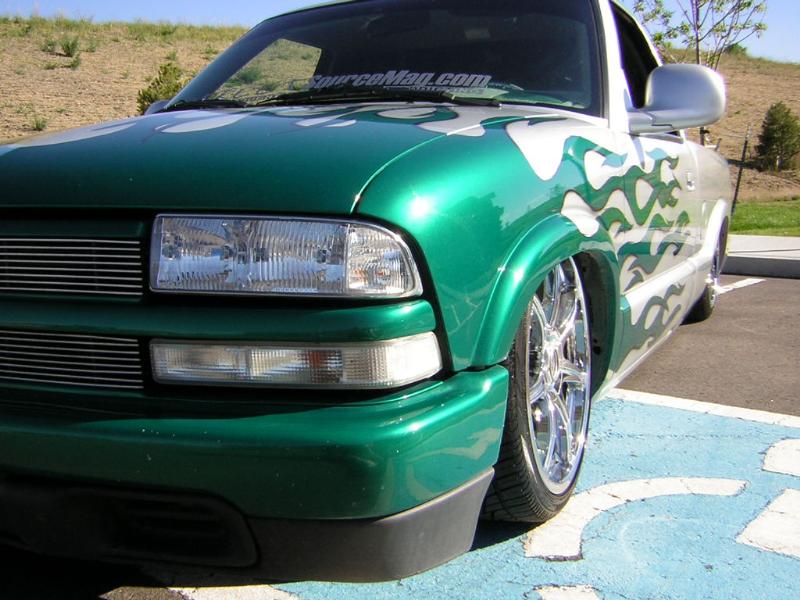 Flamed, shaved antenna, hood squirters, and molded rear pan. Rear tubbed for 22's, but decided against it cuz it looks gay