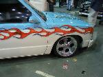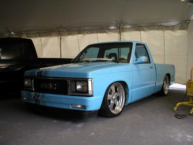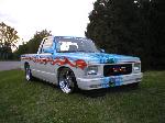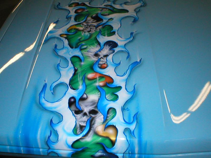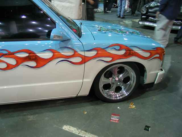 paint:Dupont chromabase baby blue and volks beetle beige.airbrushed skulls and flames design all around & on hood and bumper.shaved antenna and tail gate handle a molded steel rollpan and a 94 gmc front end.M3 style mirrors w leds,euro taillights,clear corners and bumper lights.