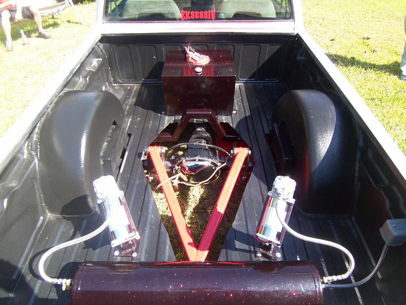 Front- 2600 lb slam bags bags, upper and lower control arms powdercoated, 2'' drop spindle. Rear- 2700 lb slam bags, 2 link with wishbone, with all bars back. all half inch line and asco valves. 2 chrome viar 380's