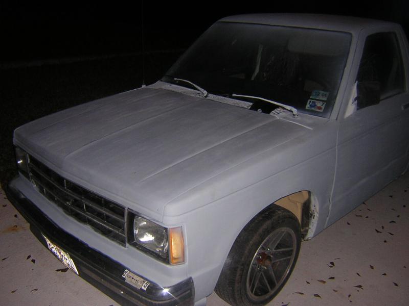 Primer grey, euro tailights, chrome front grill, lots of overspray but that will be gone soon