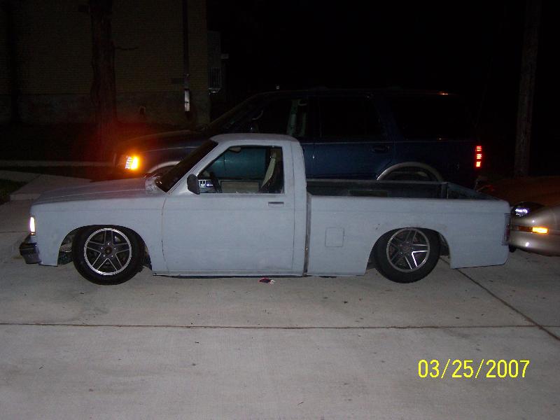 Hot rod paint job, 18 inch centerlines smoothies, 3.5 inch bodydrop, shave the door handles and weld the tailgate shut, Leds, fiberglass center console with one ten in the back and some kind of interior