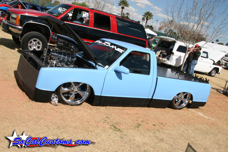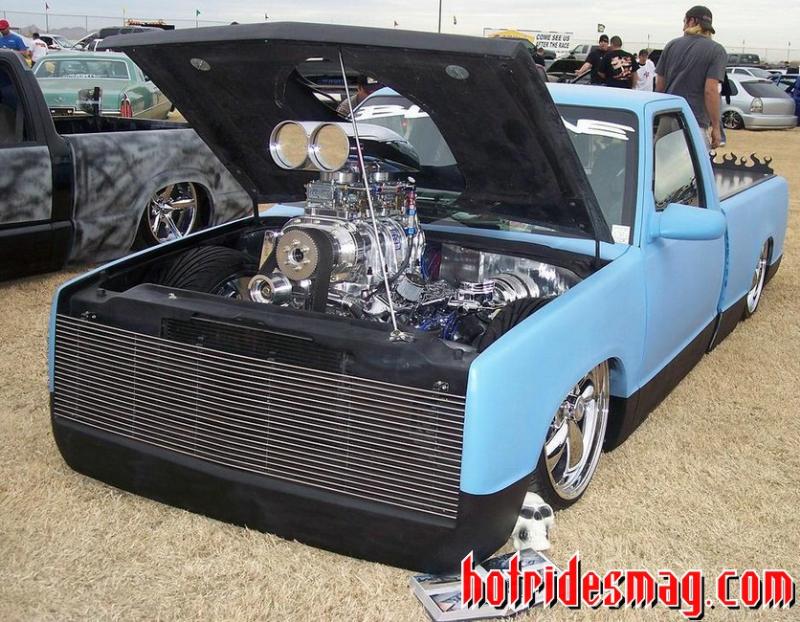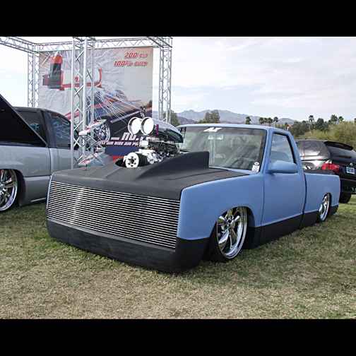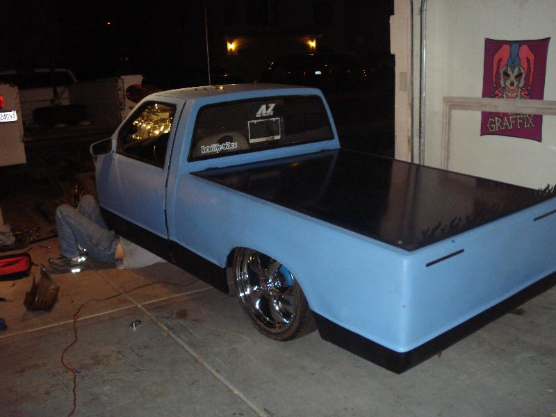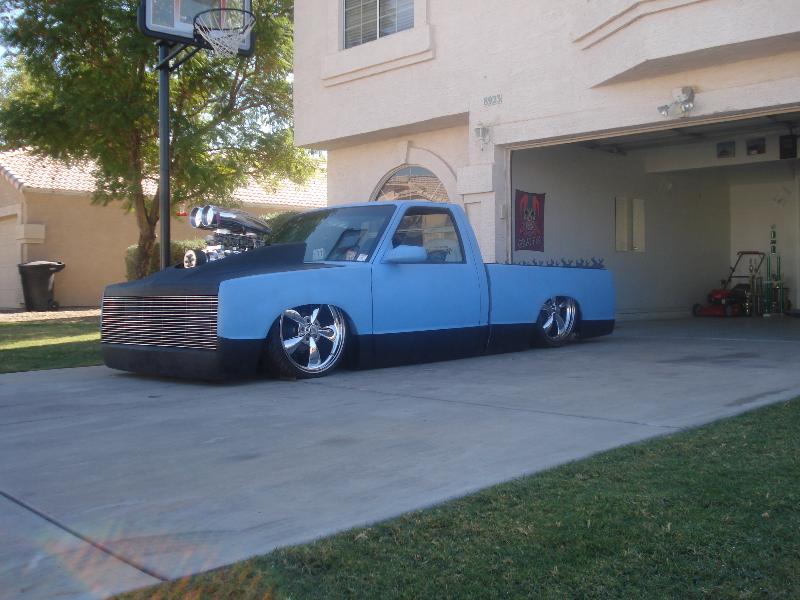everything shaved,bodydropped,6 inch cowl inducted hood,full size blazer billet grill cut down & front end molded to fit ,flames cut in hood & custom skid plate