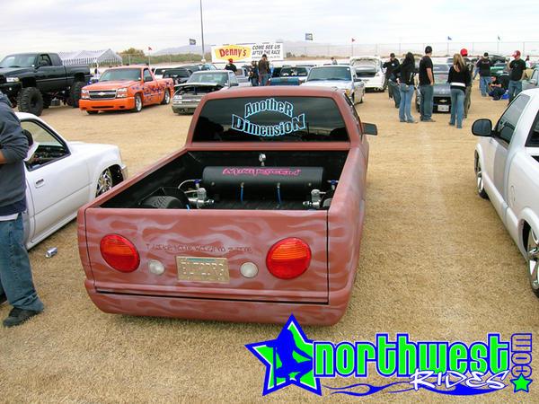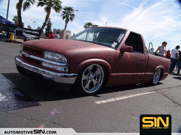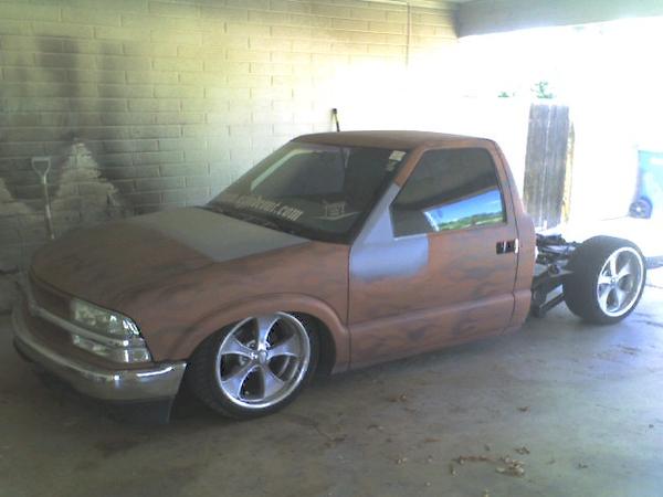 Rockin flamed Primer, 98+ front end, MIC Fast Flames, TYC clear headlights and turn signals, Billet bowtie, relocated tailgate handle, Molded Steel FBI rollpan, shaved tails, 99 VW beetle lights, shaved 3rd brake light, Shaved Antenna & shaved bed seams.
