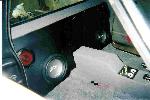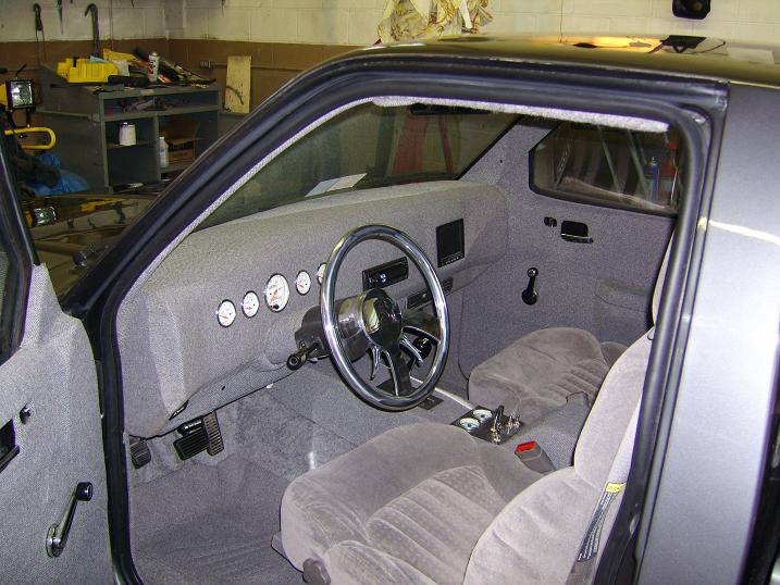 Fiberglassed dash with autometer gauges, head unit, LCD screen and DVD player. 99 S10 bucket seats, fiberglassed subwoofer box molded to back wall of cab.