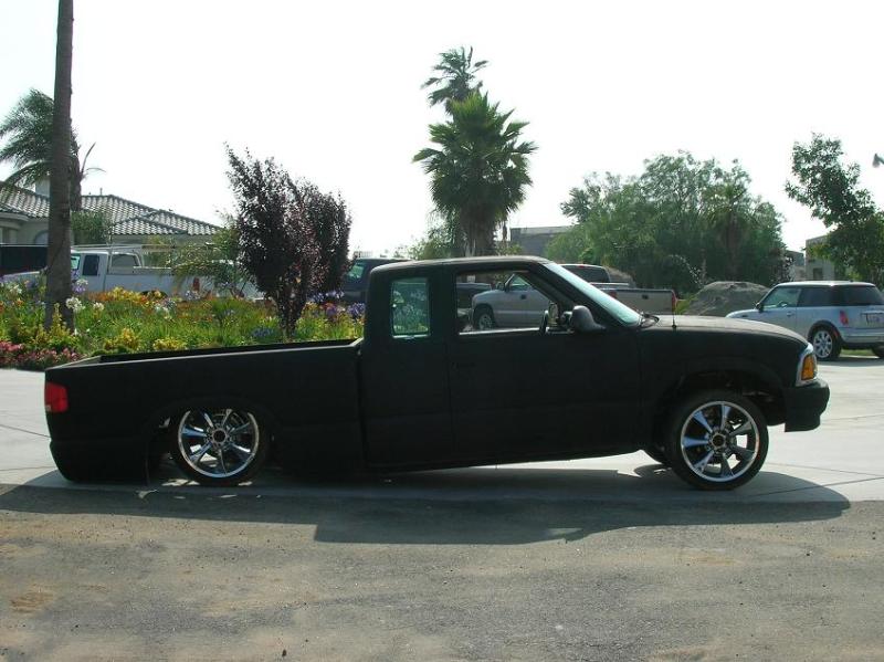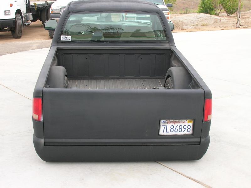 shaved third brake, tail gate, smooth roll pan, relocated lic box, hood squirters, primered black with pinstripping