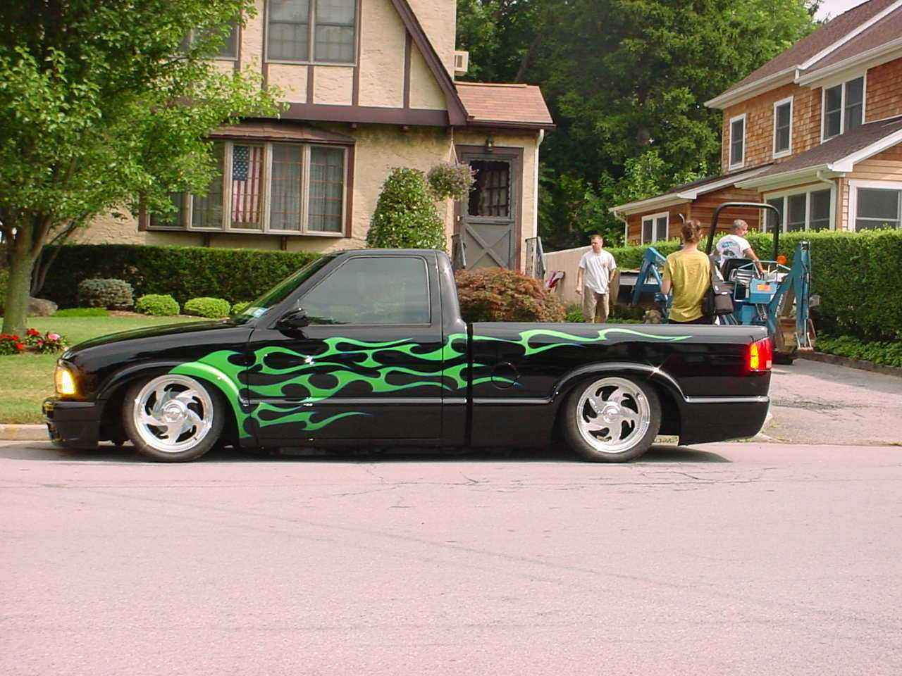 frenched front plate blazer grille speed grilles street scene mirrors flush bed cover shaved gate,handels,squirters,antenna,led third brake light, roll pan,lime time green tribal flames w/ blue slash stripes