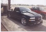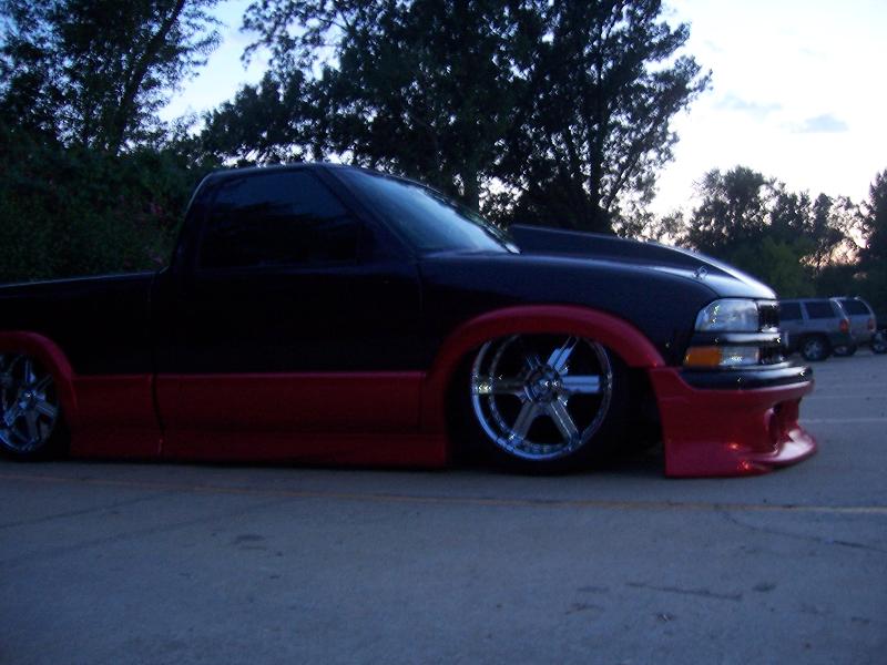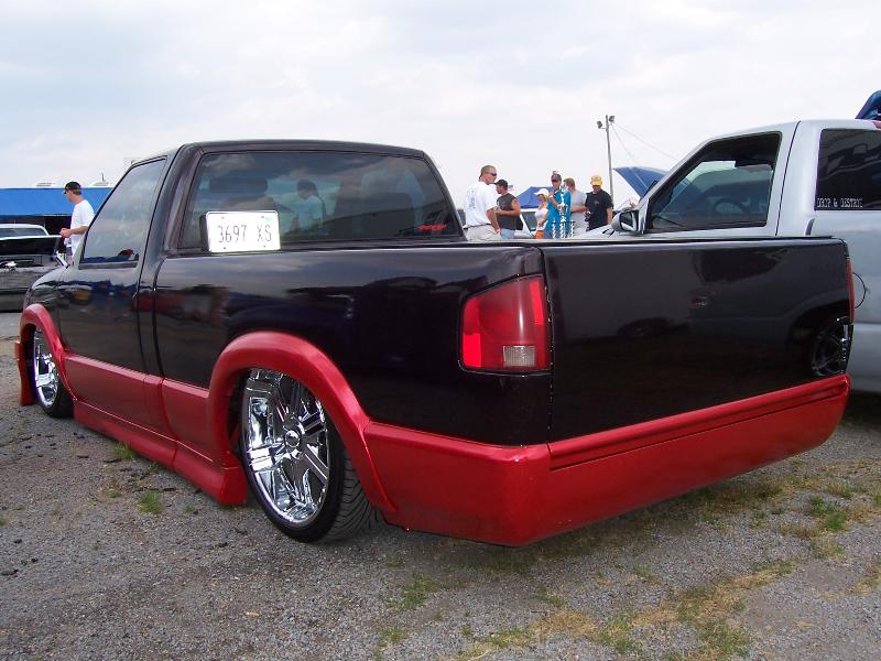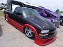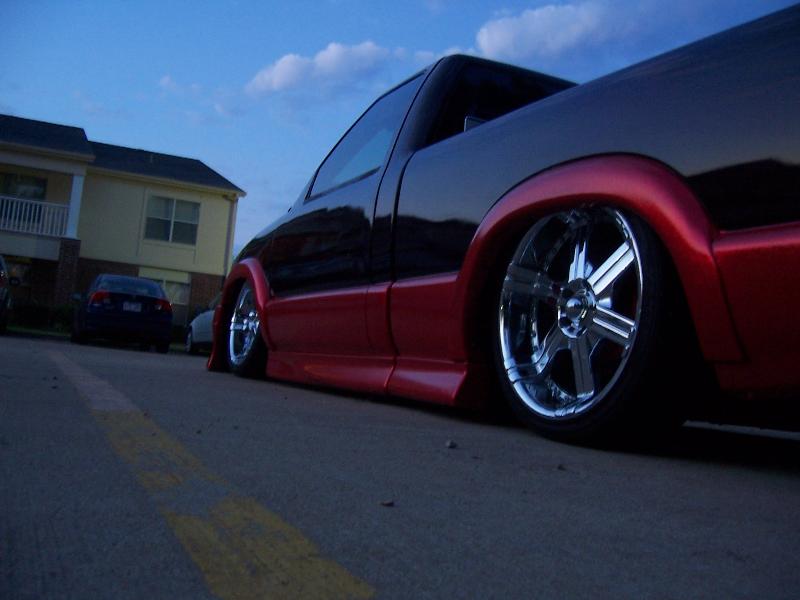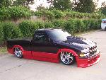 shaved mirors, door handles, squirters, fuel door, third brake light, antenna, tail gate handle, FBI rollpan, Zenon front bumper cover, UP22 4 3/4 cowl hood, smooth cowl, checker bed cover, PPG black lava red pearl on top, PPG flame red on the bottom with 6oz. of flame red Old School Flake*SOLD