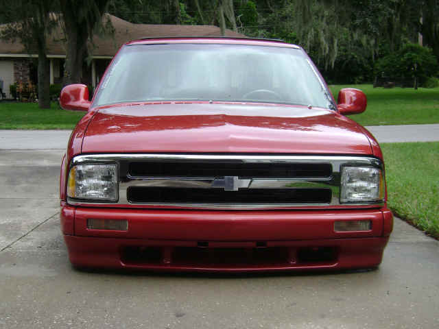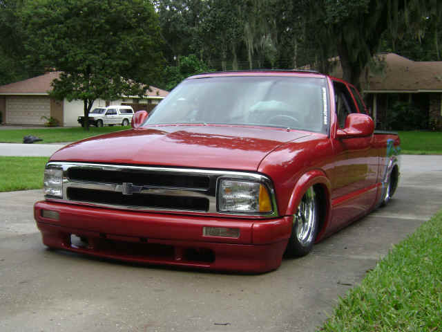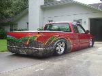 3 inch bodydrop ,shaved handles ,antenna ,hood squirters , tailights, and third brakelight, inside of bed smoothed out,96 blazer grill and headlight , 40 x 35 ragtop, along with a custom paint job