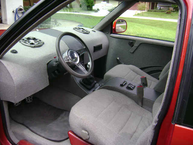 full tweed interior with a billet specialties hollowpoint steering wheel,custom dash, door panels,and custom console