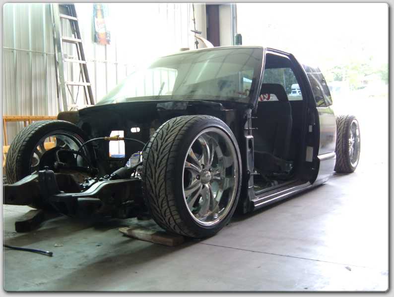 bunch of shit......Cal combo, Smooth Bedfloor, Tilt Bed, 18+ 20's, Hidden LED Tailights, Custom Envoy/01 S10 Front Clip, Fiberglass console and speaker box, custom envoy cowl hood, corvette doorhandles, Black and gunmetal paint. IT WILL "debute" at Spring Bash 06.or help me god I will kill kyle