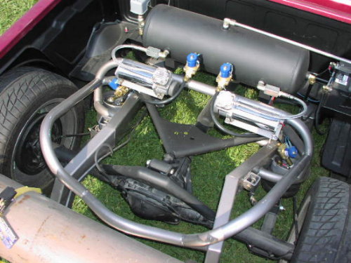 Custom rear frame clip, custom 3 link wishbone suspension, 12 1/2" GC Extreme 450 valves,(dual fill in front), 5/8" line, York engine driven compressor , 8 gallon tank, Big Azz Nitrogen tank, chained all around ...video hoppin links below... 3 foot 3 wheel also.