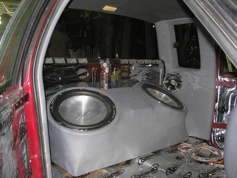 2 Audiobahn Alumapro 15" subwoofers run by 2 a2300hct amps. 4800wt's total, enclosed in a sealed fiberglass box. Mids consist of four 3 way audiobahn 5 1/2 speakers run by a 400wt audobahn a4002T amp. And a Clarion headunit