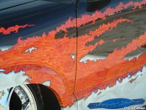 Full custom paint front to rear with hand airbrushed flames with gray swirls and white wisps in paint. two tone black and white. all paint is wrapped in door jams.