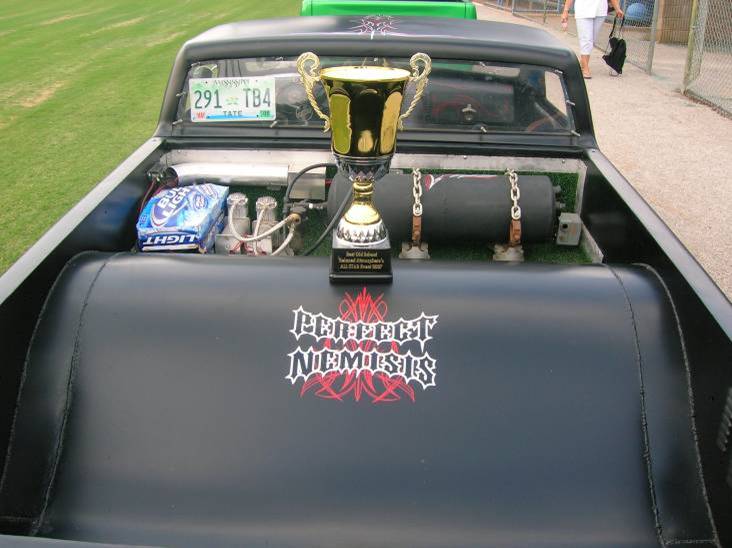 flat black with white scallops 8 inchs out of top 5 1/2 bodydrop 1949 ford windshield, hand fabbed frame and cowl, 1991 full size chevy truck roof, uni tub inside bed, smoothed with louvers on the sides, pinstripes on dash, roof, tailgate, front bumper,cowl, and hood, one off grille and rear roll pan, tailgate shaved as was the taillights, mirrors, antenna