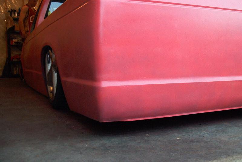 pink primer, shaved, bodydropped 4 1/2, suicide doors, tubbed with matching bed lines notch cover, crooked front plate in bumper