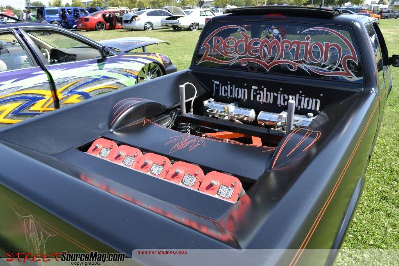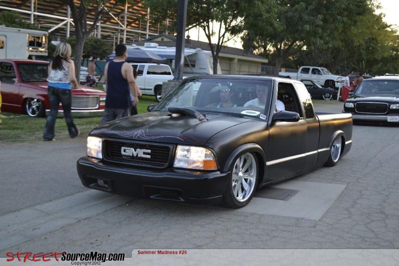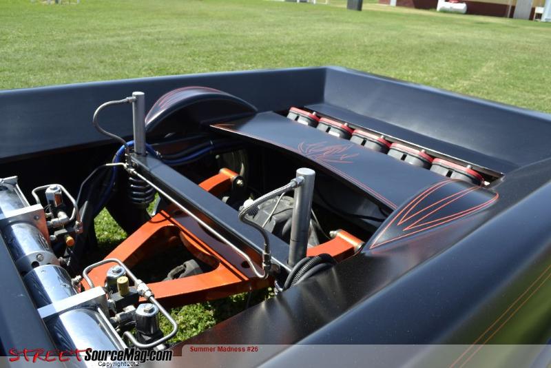 trad. body drop, shaved; doors, antenna, lights, gas door, cali combo w/ avs 11" LED lights, sheet metal bed, all done by fiction fab. Painted flat black by Kal Koncepts w/ pinstriping by Air Syndicate also painted back window by Air Syndicate.