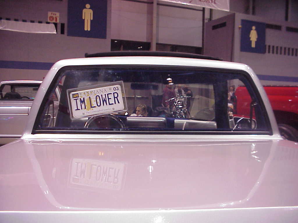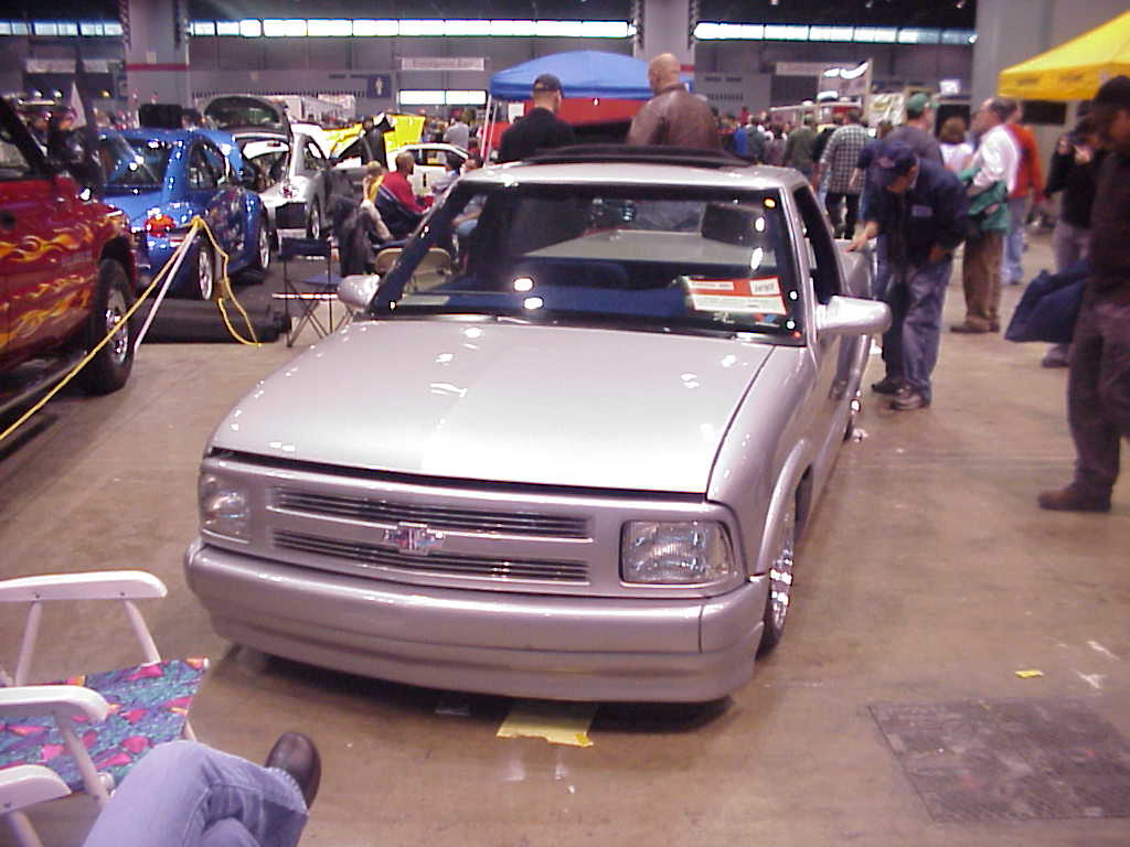 body drop with full tube frame, dupont silver arrow met paint. shaved ass end, with l.e.d's and plate frenched in back window, welded shut bed cover with gas door relocated in as well, shaved door handles and antenna, all body lines in cab including third break light, 1997 blazer headlights, and air tank in the bed.