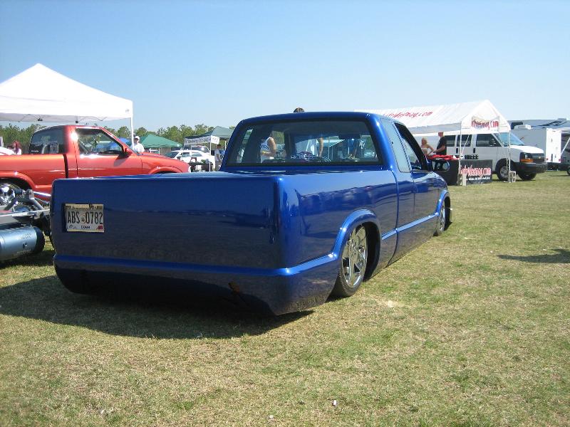 trad. b/d 3 1/2, cowl hood, shaved wiper cowl, door handles, third brake, gas door, sheet metal bed with radiused corners, frenched tag, motorcycle pop-up gas cap, custom trucker lady taillights, street scene mirrors, 98 bumper & valence. All work done by Mike @ Endless Fab. in Dallas, GA. 678-758-2563. Paint is 350z blue. Special thanks to Al & Jesse for the paint job.