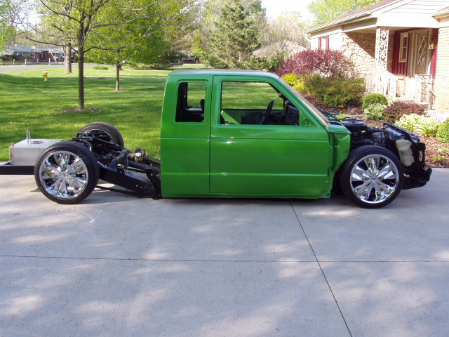 2,600 lb firestone bags on all 4 corners, triangulated 4 link, 10 switches, 1/2 fill 3/8 dumps w/ 1/2 lines, 2 viair 450 compressors, 2 5 gallon air tanks, 15 gallon aluminam fuel cell, tubbed, 2" drop spindles, tubed framing from cab back done by Trend Setter Customs in Dayton, Ohio