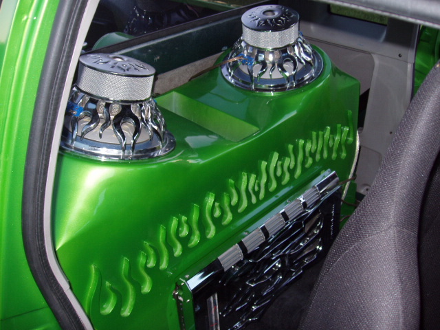 2 12" Audiobahn flame Q, audiobahn 2400 watt amp, and a 2.4 fairet digital powercap, and custom fiberglass/wood box painted pearl green to match the truck