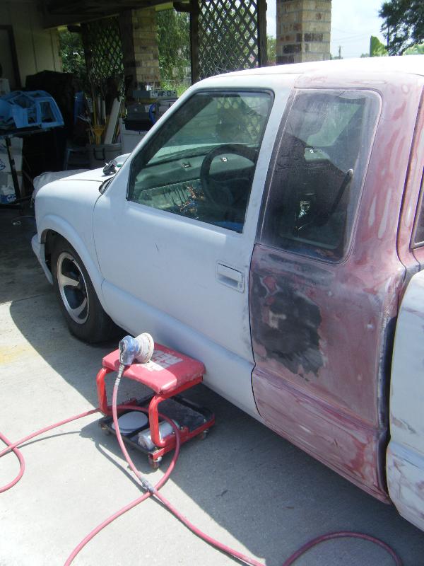 shaved mirrors,shaved gas door,filler neck for the gas in the bed,Shaved pass side door,shaved 3rd brake light,shaved taillights.shaved antenna,shaved tailgate handle,Shaved license plate box on roll pan,Molded-in roll pan,custom star license plate bracket mounted in bed by tailgate,ram air style hood,swaped front ends from a 99 s10 truck to a 97 s10 blazer.I have a 2tone primer paint job b