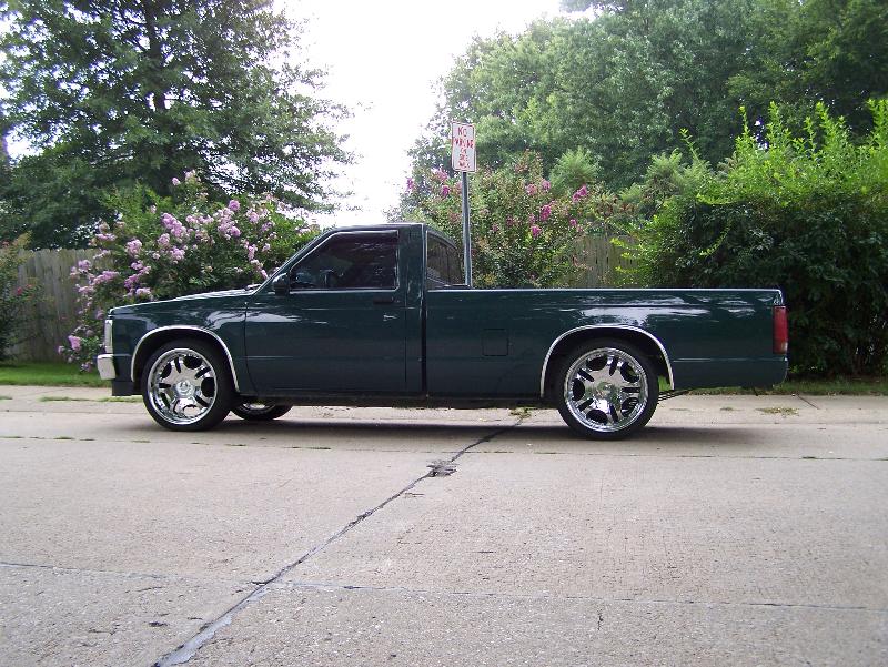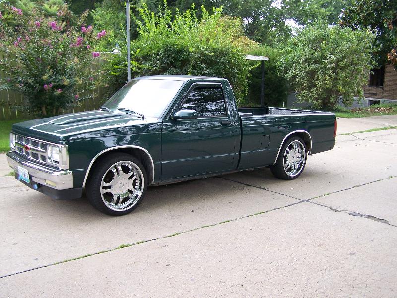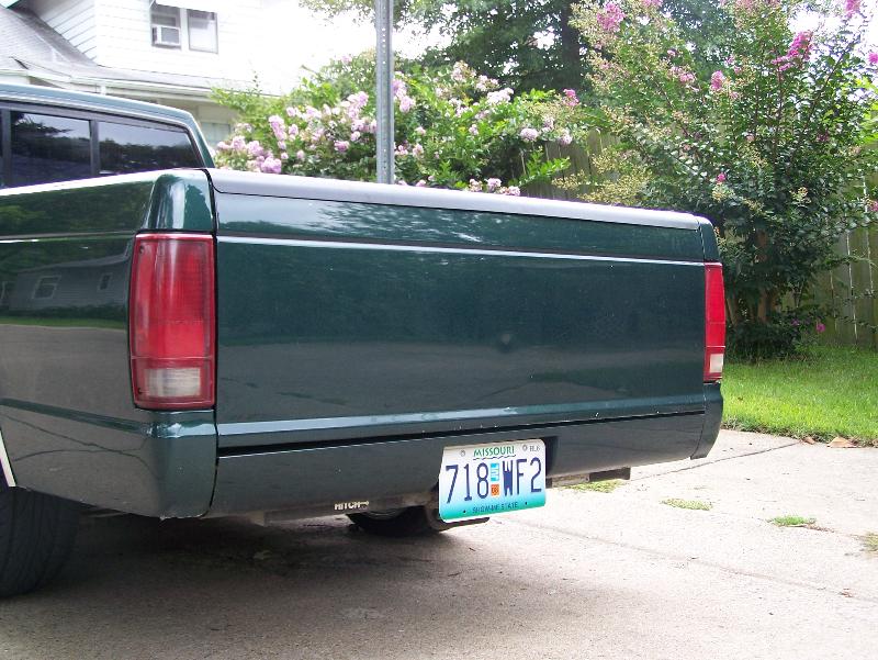 shaved tailgate, rollpan, sliding bed cover, metallic hunter green paint, imitation cowl hood,chrome grille, clear corners, chrome 93' bumper,all stock emblems and molding shaved off, sport mirrors, green neon under glow, hidden trailor hitch, flip up license plate.