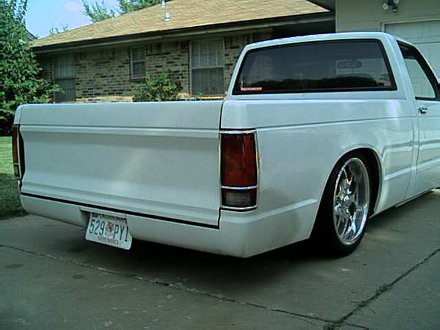 Billet Grill, Shaved antenna, molded in rollpan w/license tag in the center, shaved smooth tailgate, tailgate handle relocated to inside of tailgate, Painted to match front bumper, Street Scene sport mirrors, diamond cut Halogen head light conversion with relayed day time running lights, crystal eye bumper lenses, crystal eye corner markers, FBI billet grill w/19 bars, FBI Billet license plate tag, New front air dam, All new exhaust: 2-chamber Flowmaster muffler, no cat, all relocated 2 & 1/2" pipe w/3" outlet dumped in front of the differential, Painted (red and yellow front brakes & red rear drums) New transmission seal, soft clutch with quick throw pressure plate, new front brakes, 2 & ½” sway bar off 93 s-10 blazer, new sway bar bushings, master flow fuel filter, new higher flow fuel pump, 3/8 thick transmission protector skid plate.
