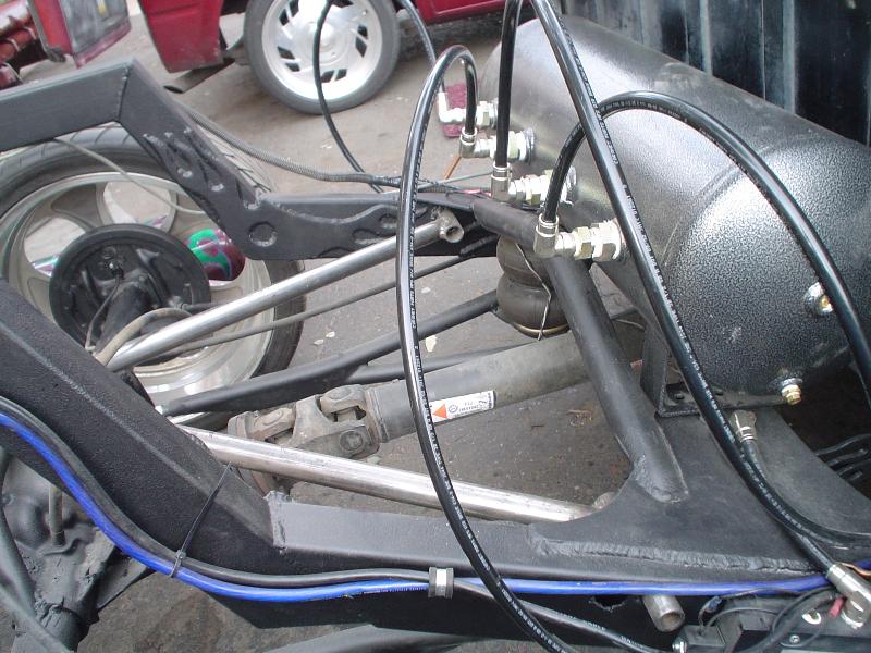 Firestone 2600's in front and 2500's in rear, custom 3 link rear, tubular control arms, stock floor body drop(3.5")
