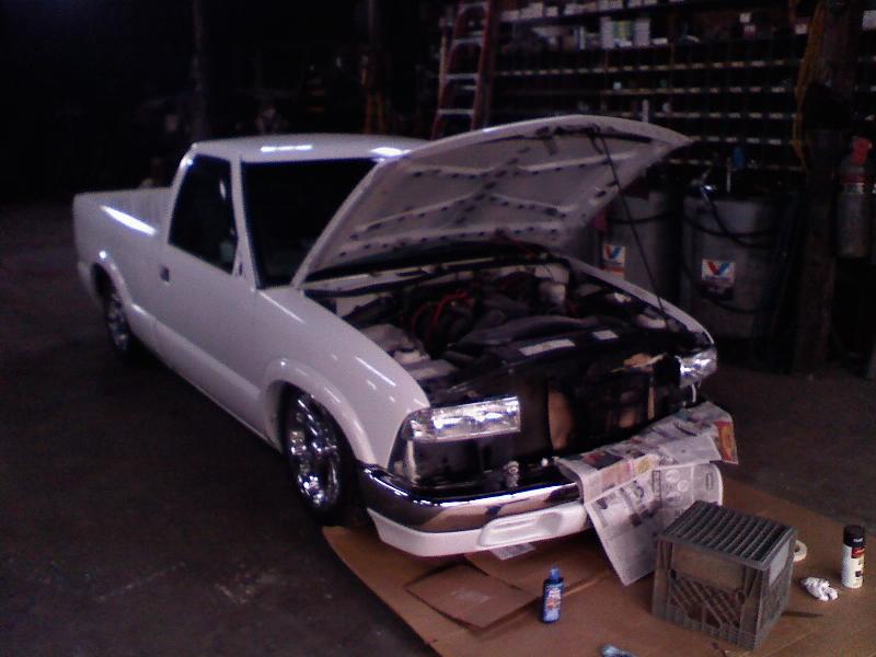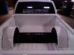 Body is straight as an arrow, 2-stage paint re-sprayed stock white, tubbed bed also repainted stock white with clear. suspension components sprayed in gloss black. grant customs smooth roll pan, shaved 3rd brake. plate bracket mounted off bed.