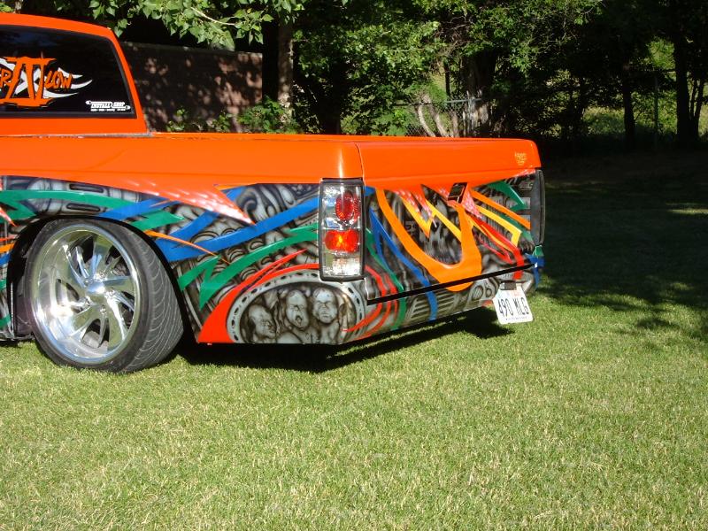 Shaved handles, locks, mirrors, antenna and squirters. planet color orange crush paint,with west-coast graphics and a bio-mechanical background