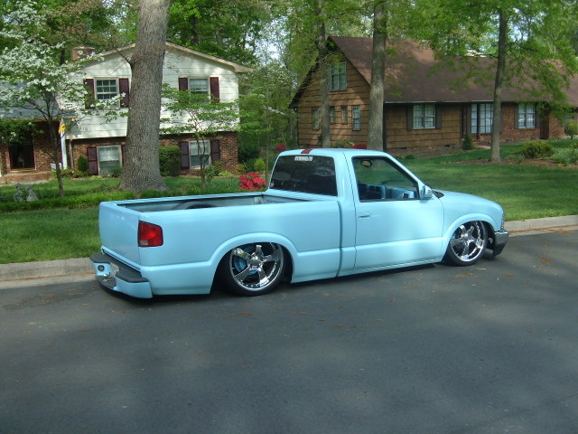 2000 chrome front bumper, shaved tailgate handle, shaved antenna, hood squirters, and upper cab seams, trailer fenders welded in the bed...painted '91 Cameo S-10 pastel blue by me & dad