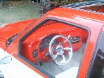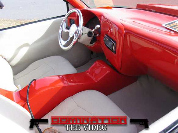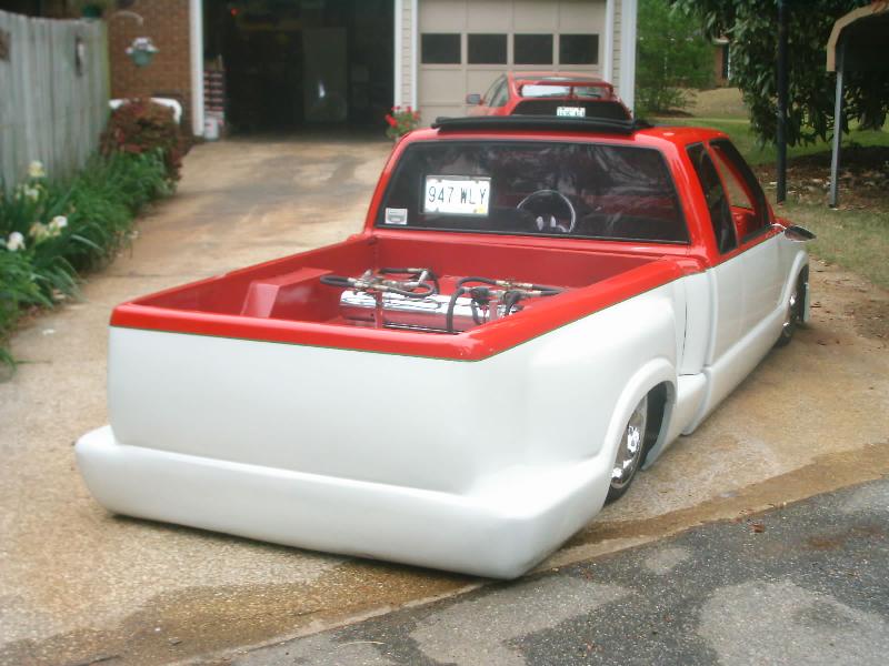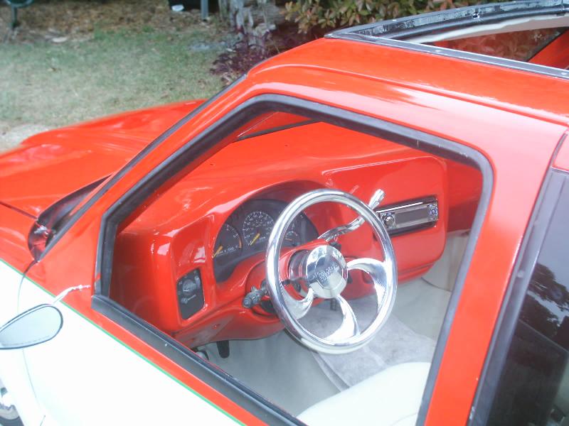 Fully shaved, with all metal steps, sheetmetal bed, and a 35x40 ragtop, painted viper red, and pearl white 2 tone with green stripe in the middle.