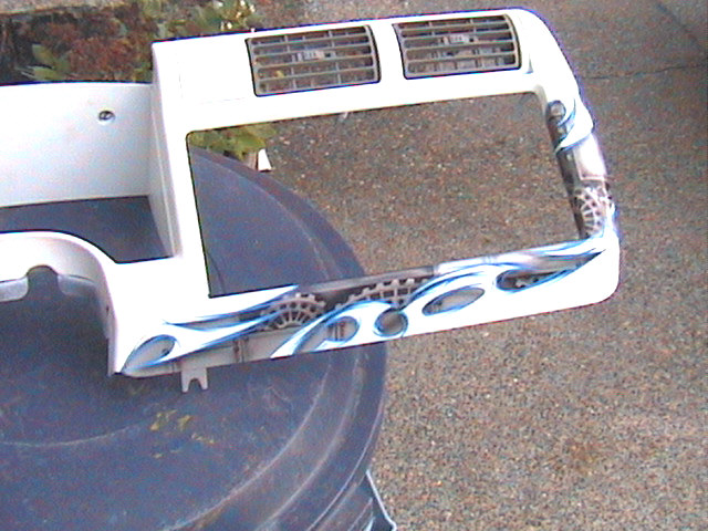 old skool Alter Images billet steering wheel, billet window cranks, Trenz billet flame rearview mirror,97 blazer seats, center console, painted white dash panel w/ graphics.