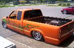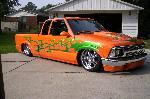 buckets out of a 2000 S-10 cover in orange and green vinal and a custom built fiberglass console and speaker box fiberglass dash door panels and headliner all other panels smoothed and painted